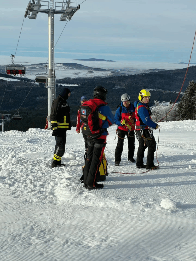 Am 06.12.2025 nahmen mehrere unserer Einsatzkräfte gemeinsam mit den Kameradinnen und Kameraden der Bergwacht Hauzenberg-Waldkirchen, der Bergwacht Wolfstein und der Bergwacht Grafenau an einer umfangreichen Übung zur Seilbahnevakuierung im Skigebiet Mitterdorf teil.