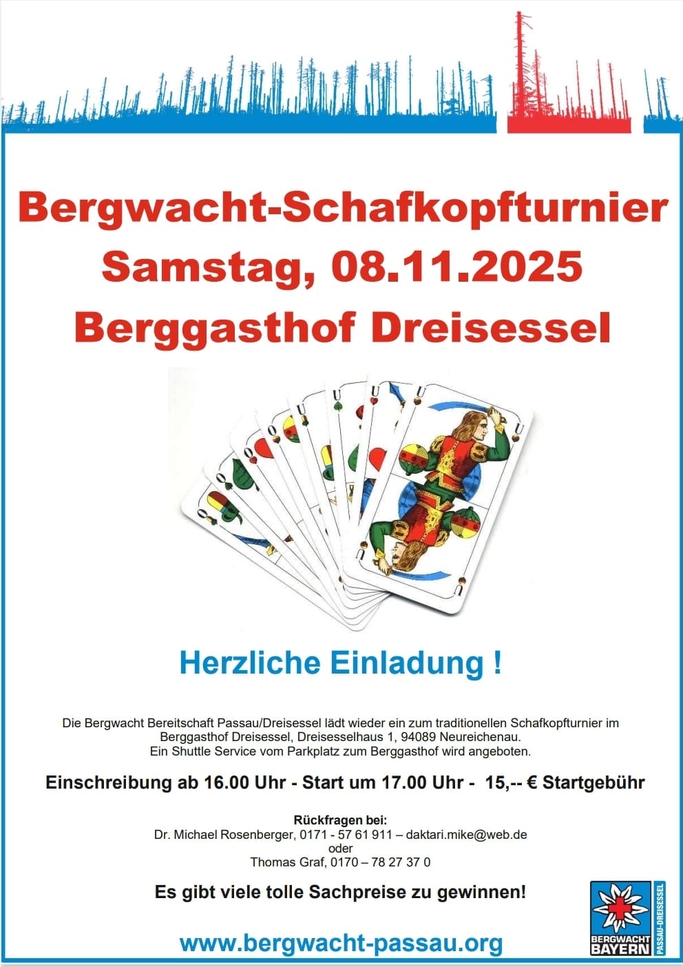Karteln für einen guten Zweck!Herzliche Einladung! Die Bergwacht Bereitschaft Passau/Dreisessel lädt wieder ein zum traditionellen Schafkopfturnier imBerggasthof Dreisessel, Dreisesselhaus 1, 94089 Neureichenau.Ein Shuttle Service vom Parkplatz zum Berggasthof wird angeboten. Einschreibung ab 16.00 Uhr – Start um 17.00 Uhr – 15,– € StartgebührAnmeldung nicht erforderlich! Rückfragen […]
